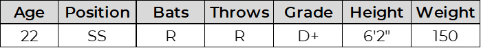 Luis made plenty of contact but without impact. The bat projects below average, and he remains raw defensively. At the AFL he primarily played 3B and SS but hss also mixed in at 2B. Needs time to physically mature and find a long term position