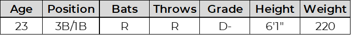 Taylor worked deep counts and drew walks but struggled to square up pitches consistently. His lofty swing with flyball tendencies and limited contact significantly impacts his ability to hit for a decent average. Mixing in time at 3B and 2B, the profile fits organizational depth.