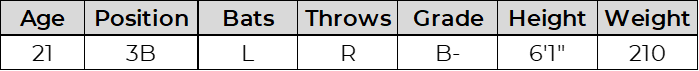 A monster among men physically, Blanco stole the show at the AFL Home Run Derby with a record 122.9 mph home run. The power is real, but so is the swing-and-miss. He profiles as a true three-outcome bat and likely fits best as a DH at the next level.