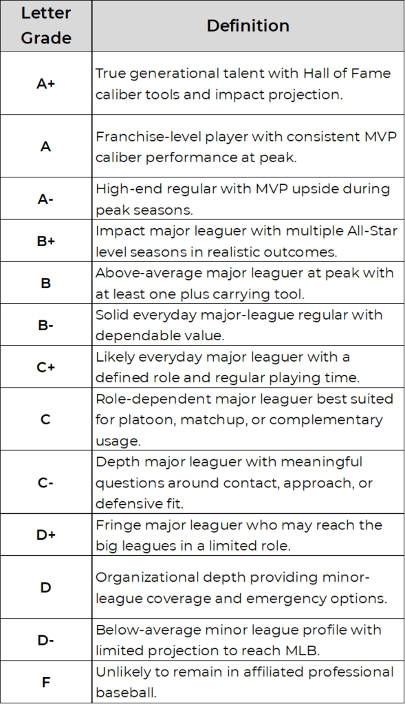 To keep evaluations consistent and easy to interpret, I used the grading key below to assign player grades.