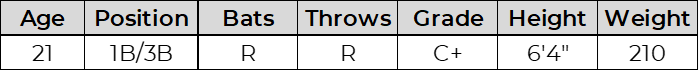 A big-bodied hitter who still looks athletic for his size, Harber showed a patient approach and put together multiple quality at-bats in the limited time I saw him. I was impressed by an opposite-field home run that came on a 10-pitch at-bat. He has been on a tear since being traded from the Yankees and will get his first taste of the upper minors soon. He is an older prospect for the lower minors, but will be an interesting name to monitor as he gets tested against upper-minors pitching given the underlying power metrics.