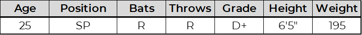 Wright showed an impressive fastball at 94 to 96 mph with life during his time in the AFL. He mixed in a plus 84 to 86 mph slider, an 88 to 89 mph changeup, and a 78 to 79 mph curveball. His command was inconsistent, highlighted by the fact that he walked more hitters than he struck out during the AFL. The raw stuff and four pitch mix give him a chance to reach the majors, but his ability to execute consistently will determine whether he sticks as a starter or moves to a bullpen role.