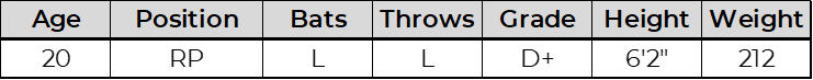 Kemp has a large frame and showed power stuff in his brief AFL look, working with a 96 to 98 mph fastball and an 88 to 89 mph breaking ball that was labeled as a cutter. He features a simple delivery with a short arm action and does a good job hiding the ball. There are some questions about the fastball shape and overall pitch depth, and at this stage he looks better suited for a power bullpen role rather than a starting profile.