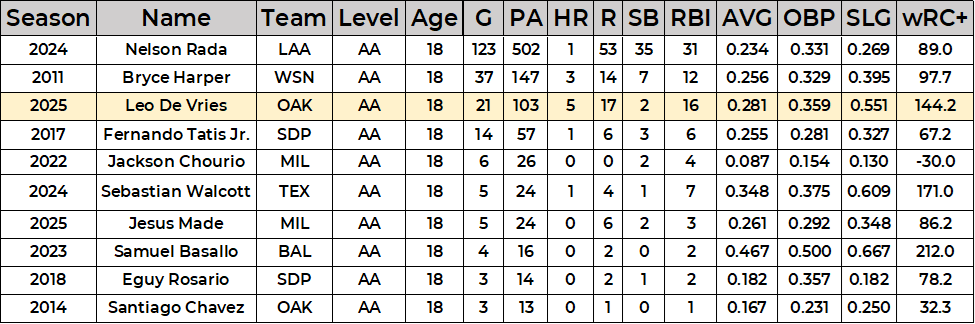 A switch-hitting shortstop from the Dominican Republic, De Vries joins a very small group of prospects who have reached Double-A at age 18 including Bryce Harper, Fernando Tatis Jr., and Jackson Chourio.
