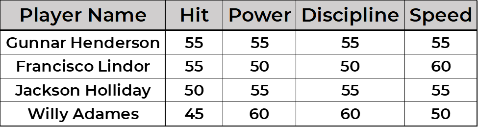 Using our internal tool grades, De Vries profiles similarly to a mix of established MLB shortstops in terms of balance across hit, power, discipline, and speed grades.