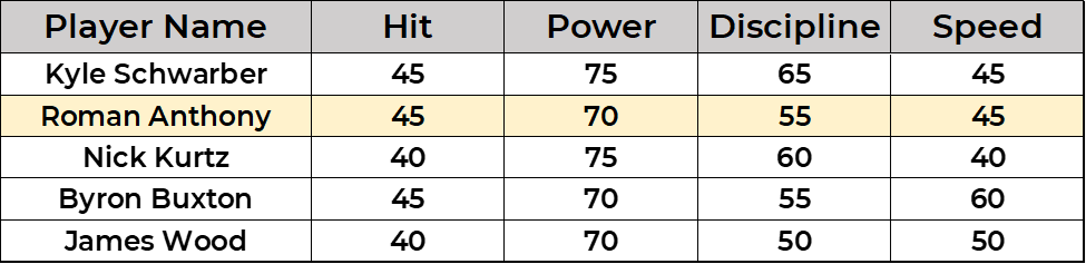 Roman Anthony has great player comps on his dynasty tool grades at an early age, drawing comparisons to sluggers like Kyle Schwarber, Byron Buxton, among others.