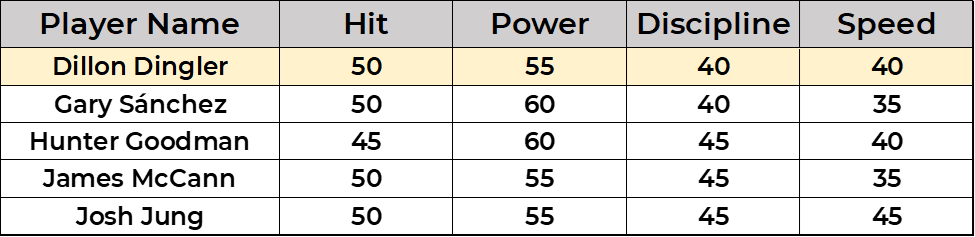 Dingler’s tool grades line up with profiles similar to Josh Jung and James McCann. He does not offer a plus offensive tool, but he brings passable Hit/Power tools for the catcher position. An increase in his Power or Discipline could help elevate his offensive profile.