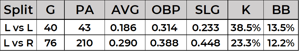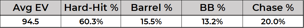 In just under half of a season, Anthony had strong underlying metrics with great quality of contact metrics as well as a low chase rate which supports his high BB rates.
