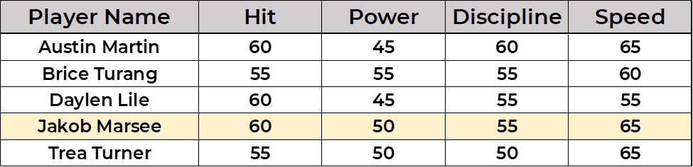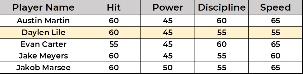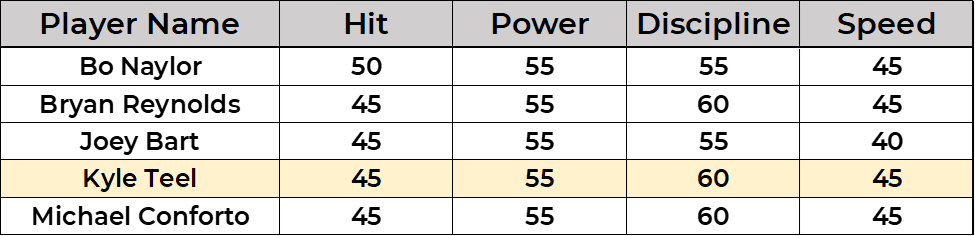 Lile’s best tool is his hit tool (60), with his whiff (18.9%) and k-rates (16.0%) better than league average. His player tool comps are below and include hitters like Jake Meyers and Evan Carter.