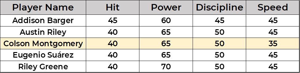 Montgomery has a package showcasing elite bat speed from the left-side. This elite bat speed gives Montgomery strong power potential similar to Austin Riley, Eugenio Suarez, and Riley Greene, though there will be plenty of strikeouts.