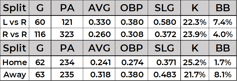 This is only one year of data, so these splits should not be weighed too heavily. He posted strong results away from Comerica Park and had real issues hitting at home. It will be worth watching if that trend continues in 2026.